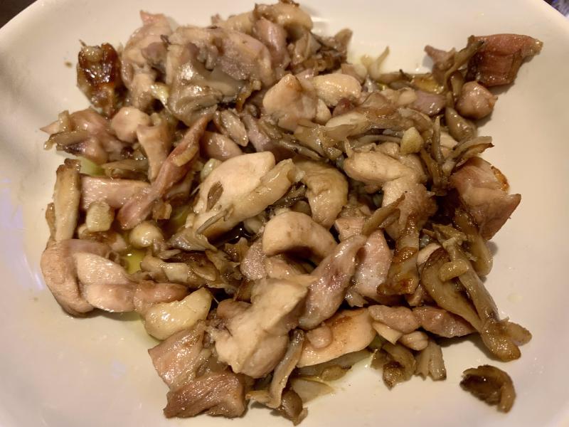 クラシルのレシピを参考にして料理しました。 鶏もも肉を食べやすい大きさに切って、ニンニクも4片くらい刻んで、あとはマイタケを入れました。 味付けは塩コショウです。 中火で炒めて、油は一旦クッキングペーパーでふき取って、最後にマーガリン(バターの代わりに)を入れて完成です。 美味しかったです。