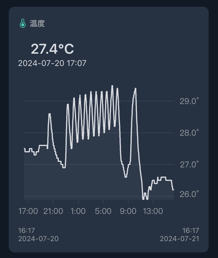 SwitchBotsの温度計はアプリで温度のグラフを表示できます。 このグラフを見ると温度センサ付きヒーターによって鳥籠内の室温がギザギザしている様子が確認できます。 とても便利なのでおすすめです。