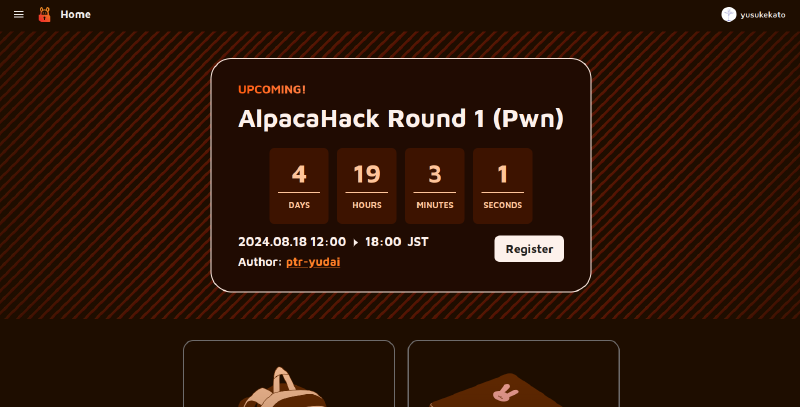 それではさっそくAlpacaHackにアクセスし、アカウントを作成してからログインします。 下記の画像がAlpacaHackのHomeページです。 Homeでは次に開催するコンテストの日程を確認できます。