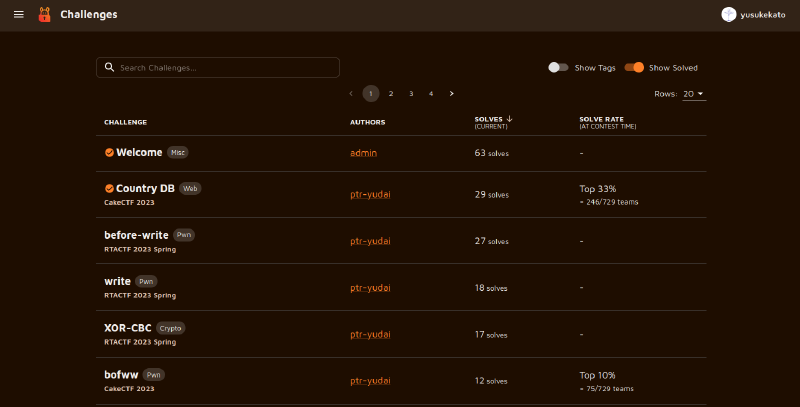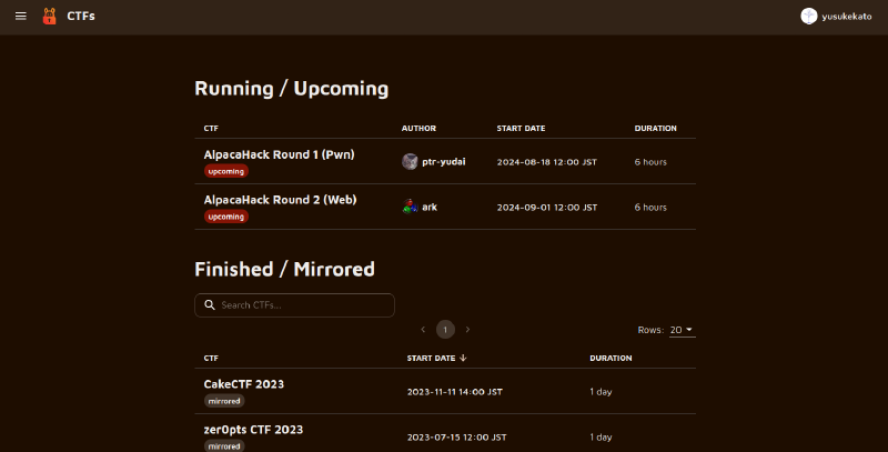 CTFsページでは今後開催されるコンテストと過去のコンテストを確認できます。