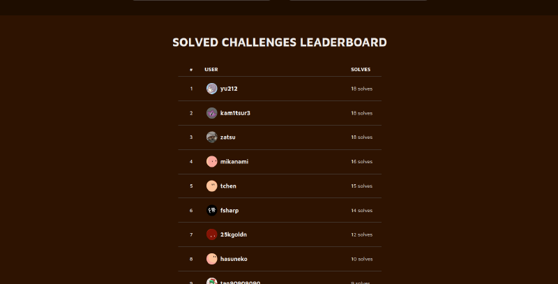 Homeのページ最下部では下記の画像のように解いた問題数のユーザランキングも確認できます。 2024年8月13日現在では18問解いた方が一位です(ちなみに私はまだ3問しか解いていません)。