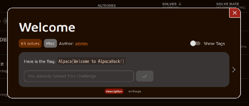 まずはテスト問題的な「Welcome」を解いてみます。 とはいっても特にやることはなくて、 この問題の概要に「Here is the flag: Alpaca{Welcome to AlpacaHack!}」と書かれているので、 flagが「Alpaca{Welcome to AlpacaHack!}」であることが分かります。 AlpacaHackではflagは「Alpaca{…}」の形式となっているようです。 正解のflagを入力して「Submit」ボタンを押すと「Solved」と表示されます。