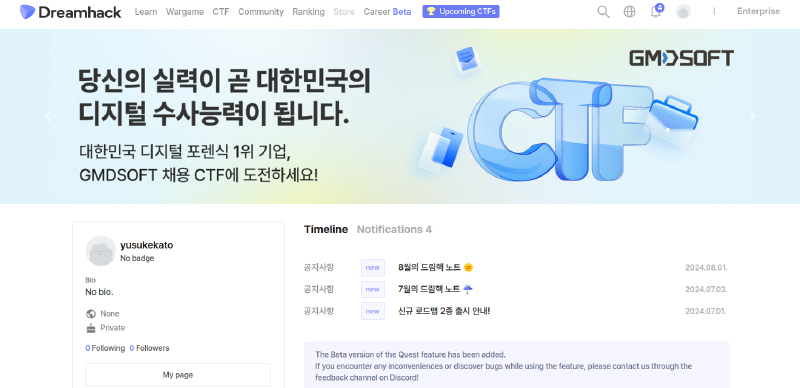 AlpacaHackでCTFを始めてみましたが、私のようにCTFが何なのかもよく分かっていない場合は スタートラインに立つために他のサイトでも勉強したほうが良いみたいです。 ということで今回は韓国のCTFサイトである「Dreamhack」に挑戦してみようと思います。