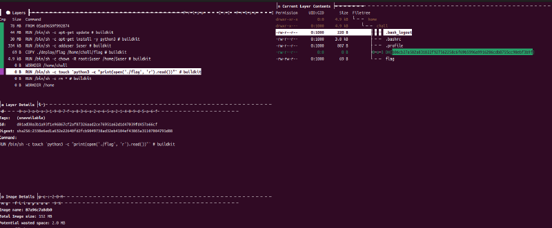 - diveでflagが削除される前のレイヤーを表示すればflagが見つかる