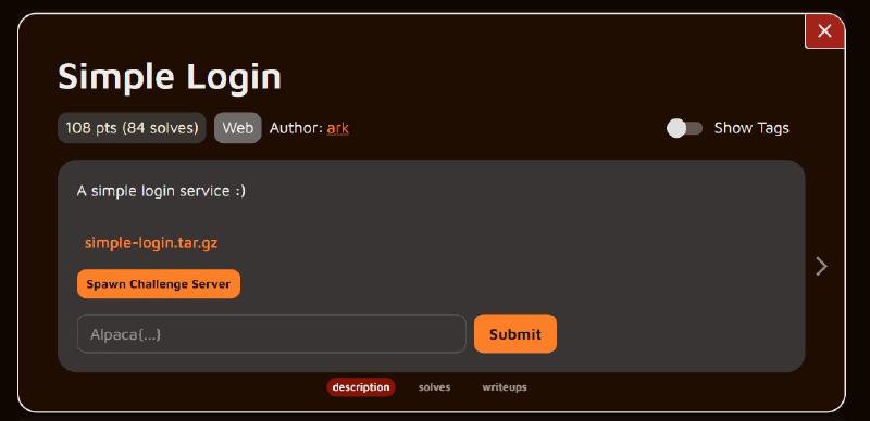 リアルタイムではないですが、AlpacaHack Round 2の問題に挑戦してみます。 今回は最初の問題の「Simple Login」を解いてみます。 ジャンルとしては「Web」とのことです。 CTFの問題はまだ数問しか解いたことがないので初心者も初心者ですが、 調べながらやっていこうと思います。