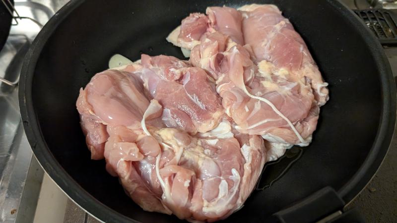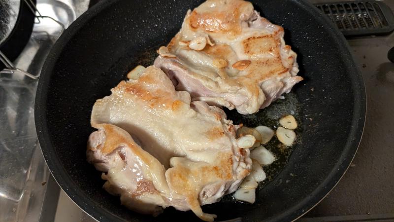 フライパンにオリーブオイルをひいてニンニクを入れて、その上に皮を下にして鶏肉を置きます。