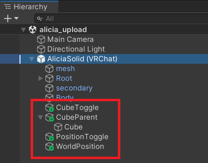 - CubeToggle:Modular AvatarのToggleを使ってCubeの表示と非表示を切り替えます(前回の記事で作成したものなので説明は省略)