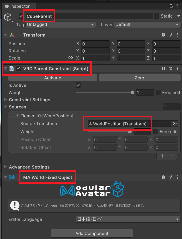 CubeParentはCubeの座標系の役割となって、Cubeの位置を決めるために使用します。 CubeParentはVRC Parent Constraintを使ってWorldPositionオブジェクトの位置に固定します。 また、MA World Fixed Objectを取り付けてワールドに固定します。 以上の設定により、CubeParentは表示された瞬間にWorldPositionの位置でワールドに固定されます。
