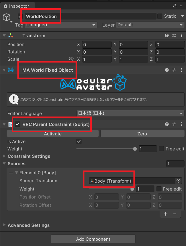 WorldPositionはワールド内の座標情報の役割を担います。 WorldPositionはVRC Parent Constraintを使ってアバター(ここではBodyオブジェクト)を追従します。 また、MA World Fixed Objectを取り付けてワールドに固定します。 つまり、WorldPositionを表示させた瞬間に、WorldPositionは現在のアバターの位置に固定されます。 これによって、CubeParentはWorldPositionに固定されるので、結果としてCubeParentの位置に依存しているCubeは現在のアバターの位置に固定されることになります。