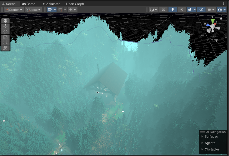 UnityではTerrainというオブジェクトでワールド内の地面を作成することができます。 ここでは地面の形状や地面の上に置くオブジェクトの配置を行いました。 先ほど準備した森の3Dモデルデータ(木や草など)もTerrainから配置することができます。