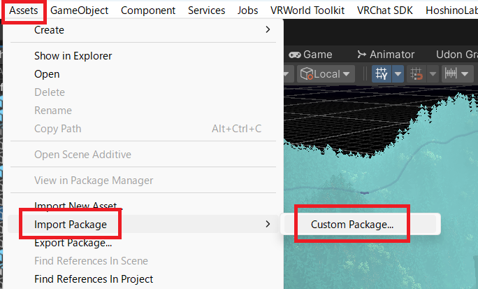 Boothで購入したログハウスをワールドの中に配置します。 購入したログハウスのデータをダウンロードしてから、Assets > Import Package > Custom Packageを選択してインポートします。