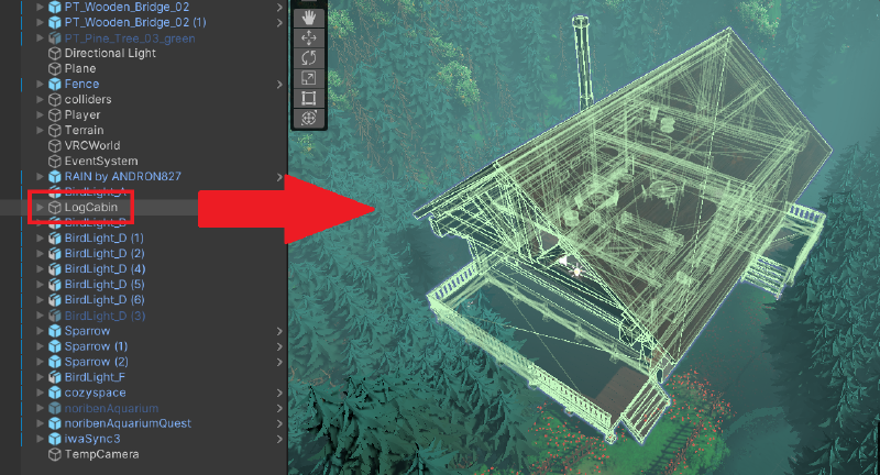 あとはインポートしたログハウスのデータをHierarchyウィンドウにドラッグ&ドロップしてワールド内に配置します。 位置や姿勢を調整すれば完了です。