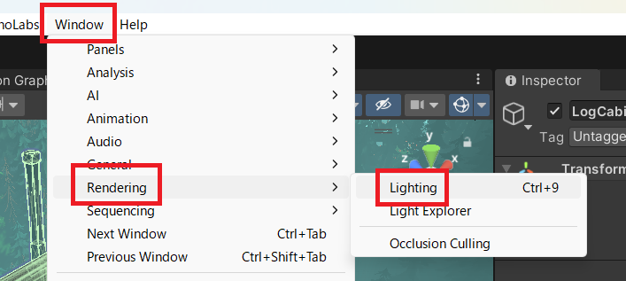 Skyboxのデータをインポートしてから、window > Rendering > Lightingを選択してskyboxの設定画面を開きます。
