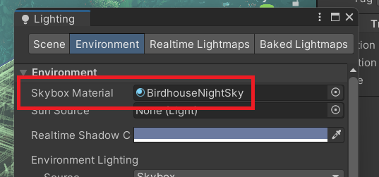 EnvironmentタブのSkybox Materialに設定したいSkyboxを選択します。 今回は「BirdhouseNightSky」を選択しました。
