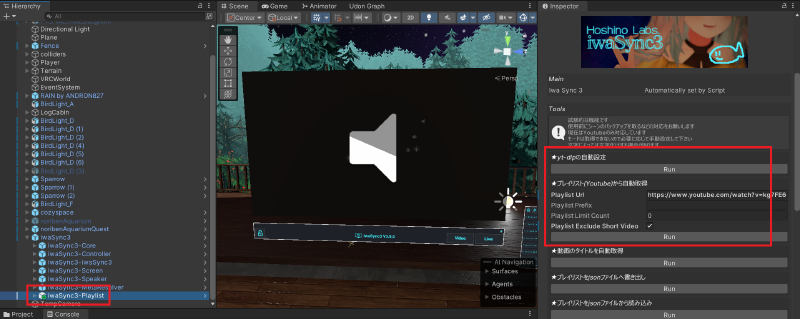 YouTubeのプレイリストをあらかじめ登録しておくと便利なので、 iwaSync3-Playlistのプレハブを追加して、 Inspectorウィンドウでyt-dlpのダウンロードを行ってからYouTubeのプレイリストのURLを入力してRunボタンを押します。 しばらく待つと自動でプレイリスト情報が取得されます。 これでVRChatにワールドをアップロードするとワールド内でYouTubeを視聴できます。