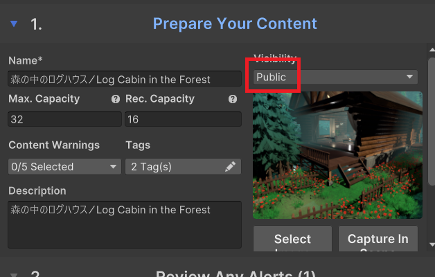 ワールドが完成したらVRChatにアップロードします。 動作確認をして問題なさそうならPublicを選択して公開します。